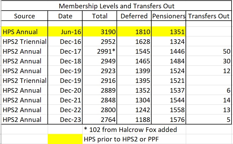 HPS2 membership has been declining since it was created in 2016. Pensioner numbers are increasing whilst deferred numbers are reducing. This pattern is going to continue until the scheme naturally finishes. It also explains why HPS2 has very largely exited growth investments and is now some 90% invested in bonds and other less risky investments. The trend in membership numbers is given below: